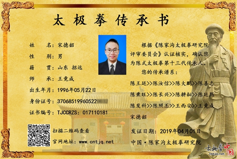 根据《陈家沟太极拳研究院评审委员会》认证核实,确认您为陈式太极拳第十三代传承人。