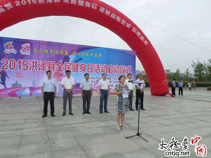 8月8日是全国第七个全民健身日。清晨,在江苏省洪泽县城欢乐广场上,鼓乐震天,人山人海,彩旗飘扬。由洪泽县委、县政府主办,县体育局、县总工会、县文广新局、高良涧街道办承办的“2015洪泽县全民健身日活动启动仪式”在这里举行。县四套班子有关领导、各有关部门和单位负责人,各有关体育健身展示代表队,高良涧街道部分社区居民以及志愿者上千人参加了本次活动。早上7点零8分,活动仪式正式开始。此次活动由副县长徐琳同志主持。活动首先是市民代表宣读全民健身倡议书。接着,县委副书记施恩佩同志代表县委县政府致辞并宣布活动启动,致辞中充分肯定了我县积极开展全民健身活动所取得的成绩,鼓励全县人民积极主动参加体育健身活动,为幸福洪泽建设贡献力量。仪式上重点安排了优秀健身项目展示。县老年人体育协会、太极拳协会、社会体育指导员协会、体育舞蹈协会、健身气功协会、健身协会组织的近700人规模体育健身展示代表队展示了“军鼓”、“太极拳”、 “太极剑”、“健身气功”、“柔力球”等9个体育健身节目。