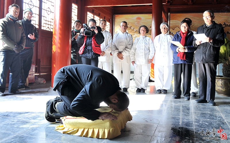 拜师仪式正式开始,先由陈炳太极院院长陈炳老师上香祭祖,寓意太极拳以旧带新,代代传承。接着贝图老师上香敬酒,象征太极拳的发展也必将蒸蒸日上。5个外国徒弟按照中国拜师的传统礼仪,依次跪拜太极拳祖师,师父、师爷,双手捧茶单膝跪地,挨个把茶敬给师父,并递交拜师帖,师父回帖并颁发入门证书。