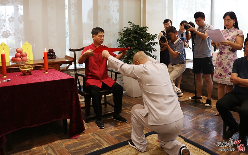 新入门弟子谷昕宣读拜师贴、递交拜师贴、敬拜师茶、行拜师礼;师父为弟子谷昕披挂绶带、颁发师徒帖并赠送太极拳书。在众人的见证下,师父张福旺带领弟子谷昕一齐向太极始祖陈王廷行叩拜礼,拜师仪式圆满礼成。