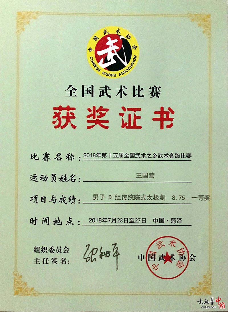 王国营收到温县体育局要代表温县参加全国武术之乡武术比赛的任务后,积极训练备战,终于在众多武林高手中为再次家乡夺得传统陈式太极拳、陈式太极剑两枚金牌。