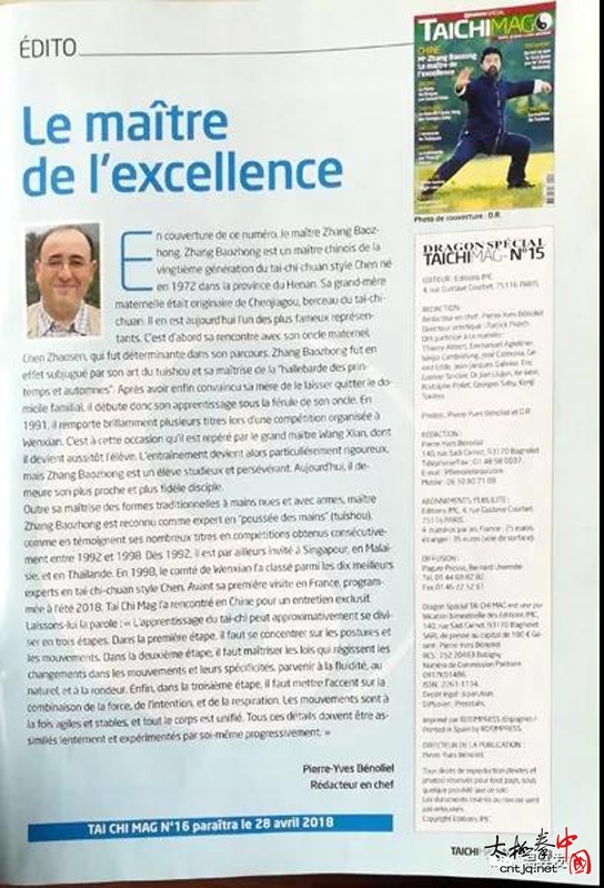 作为法国最权威的太极文化类杂志,杂志不惜笔墨,对张保忠校长进行了大篇幅报道。同时,总编亲自撰文,在前言处专门对张保忠老师进行了详细推介,这在杂志也开了先河。据悉,张保忠校长2019年将应邀再赴法国进行讲学授课。