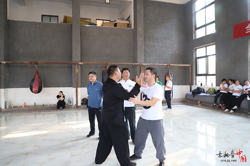 培训现场,陈小星大师亲自示范太极推手,陈家沟太极拳学校总教练陈自强老师作为助教在教学过程中亲力亲为。