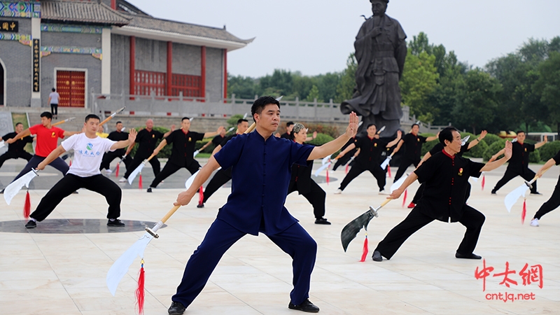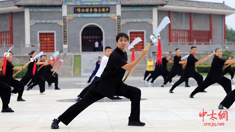 国家级非物质文化遗产陈式太极拳代表性传承人朱天才大师领衔数弟子于陈家沟太极拳祖祠、太极拳博物馆前演练春秋大刀,大家感受着太极拳发源地的灵气,进退间自成天地,迈着整齐划一的脚步,一招一式都传达着大家对太极拳的无尽热爱,现场气势震撼,霸气凛然!