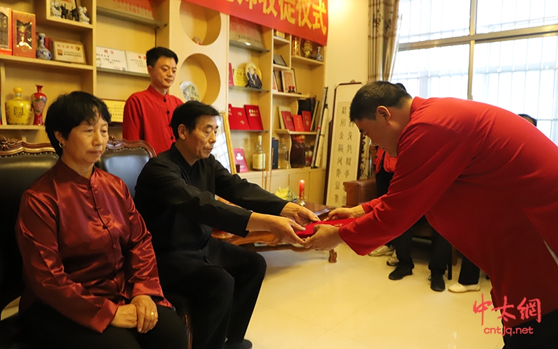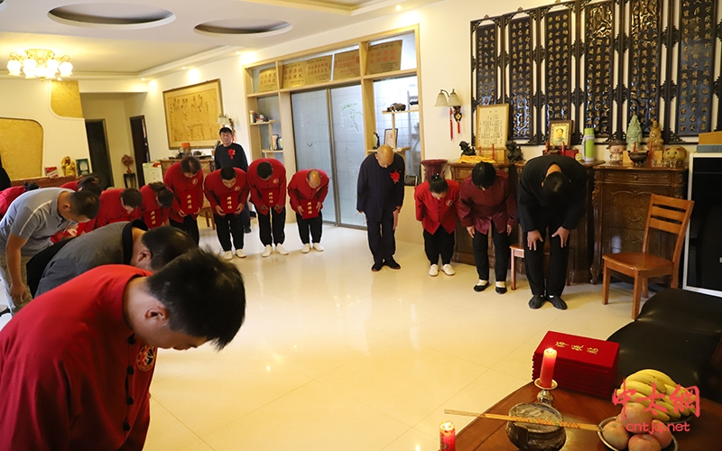 陈长流老师向太极拳始祖上香、敬酒、行叩拜礼完成了祭祖仪式。随后,新入门弟子依次上前向师父师母宣读拜师贴、行叩拜礼、递交拜师贴并接受师父回帖,正式拜入其门下,成为陈长流老师的入门弟子。之后,在众多领导及嘉宾的见证下陈长流老师带领八名新入门弟子向太极拳祖师行跪拜礼,以示传承有续。