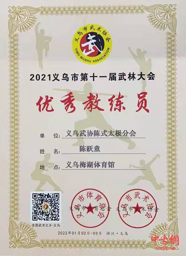 因为疫情的原因,义乌市武术协会陈式太极拳分会很多队员未能参赛,在仅有九名队员实际参赛的情况下斩获12金、7银、2铜,团体总分第三名的优异成绩,并获得“发展武术贡献奖”,陈跃童获得“优秀教练员”,丁晓英获得“优秀运动员”称号。