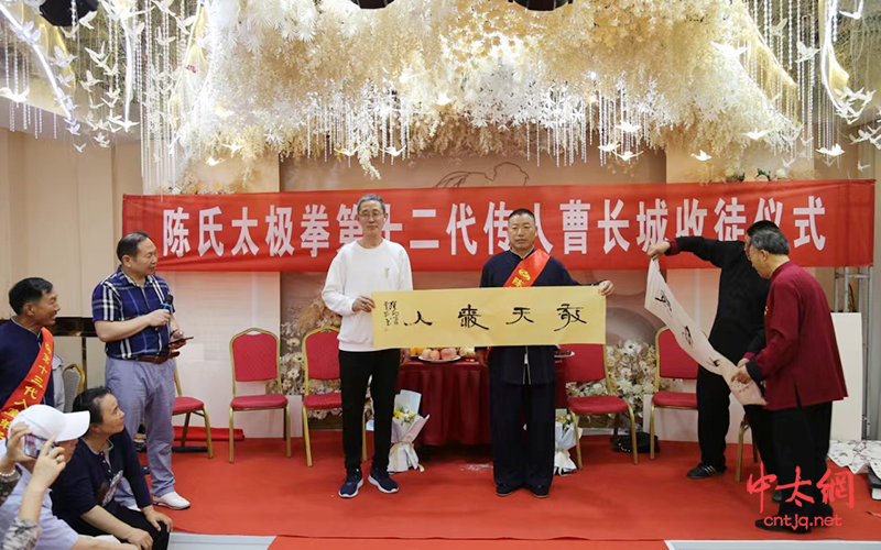 王志超、王余同在叩拜太极宗祖后分别宣读拜师誓词,并一一叩拜师父曹长城先生、递拜师帖、换回徒帖。二徒分別向师父、母(张月春、农艺师退休)三叩首,敬改口茶,“师父、师母请用茶,祝师父健康快乐!祝师母永远年轻"。师父、母回赠徒儿弟子服、弟子劍、太极密籍(陈鑫太极图说)、笔记本和红包,为徒儿披挂"陈氏太极拳第十三代传人绶带。曹长城的双胞胎外孙魏麒书、魏麒修上台献花贺喜,连云港市艺术学校国画、书法教授、海州画院院长掌斌先生现场作画题字,恭贺师徒结缘。見证人何云生(中共灌云县委宣传部副部长(正科)、王建翔(曹长城启蒙老师、市太协副主席兼陈照森太极拳专委会顾问、灌云县云翔太极拳推广中心主任)在拜师帖上签名。二徒向来宾三鞠躬。