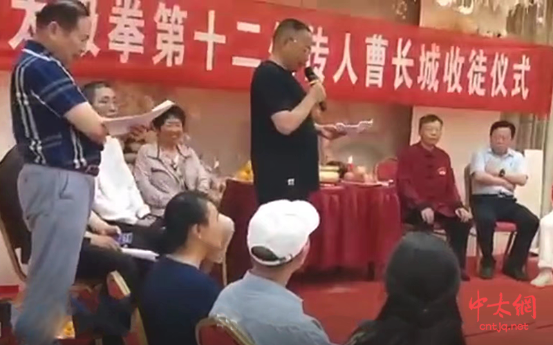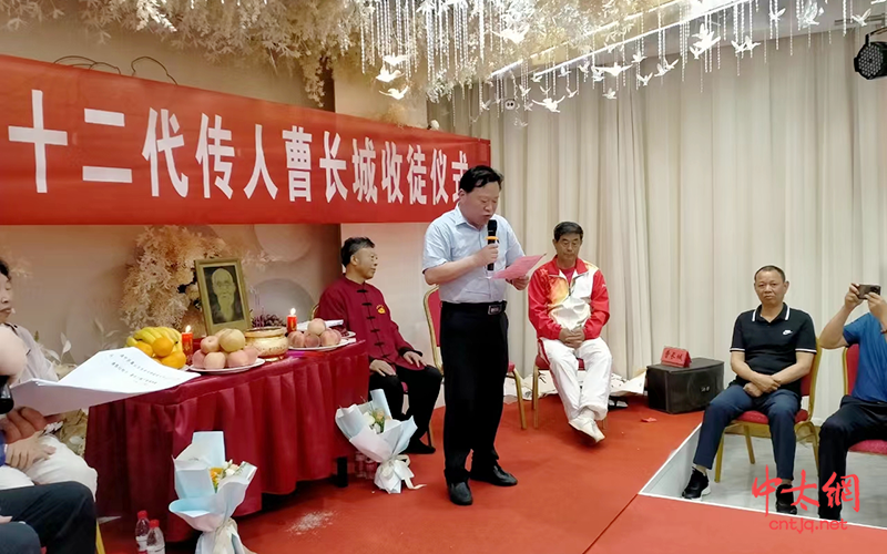 首先连云港市非遗研究会会长、市太极拳协会主席刘家平致词并亲任主持,他在致词中、说:"收徒,续的是前世今生之缘分,拜师,继的是师传国粹之血脉。曹长城老师开山收徒,为的是太极薪火相传,造福在海一方的人民。王志超、王余同拜师,为的是与师一道深究拳理、把握真经,让太极拳利己、健民、强国!"