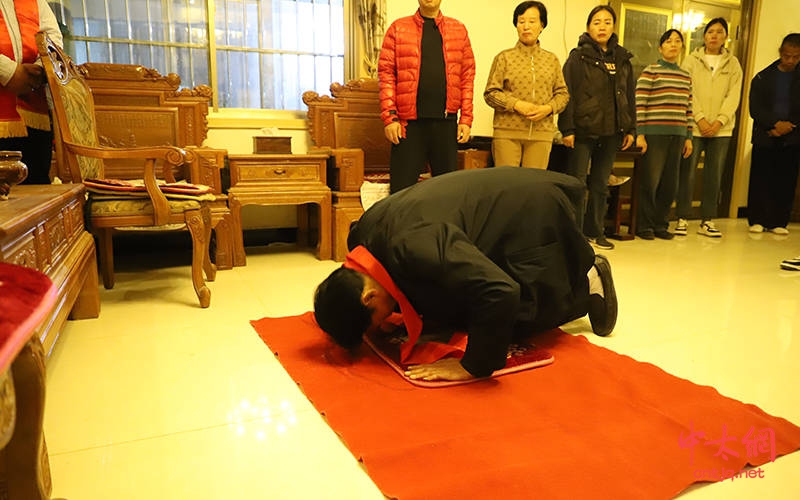 拜师仪式上,陈长流老师首先向太极拳始祖陈王廷上香、敬酒并行跪拜之礼,祭奠先贤,祈求祖师佑泽师门。新入门弟子依次递交拜师帖、行拜师礼,师父回帖、随后师父带领新入门弟子向太极拳始祖跪拜,追忆先辈创拳之恩德,感念先贤传拳之辛劳。