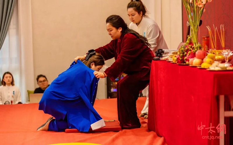 王静为弟子披上弟子服,宣读师训、门规并赐弟子名号。最后师徒共同再次祭拜,同表传承弘扬素禅的初心。