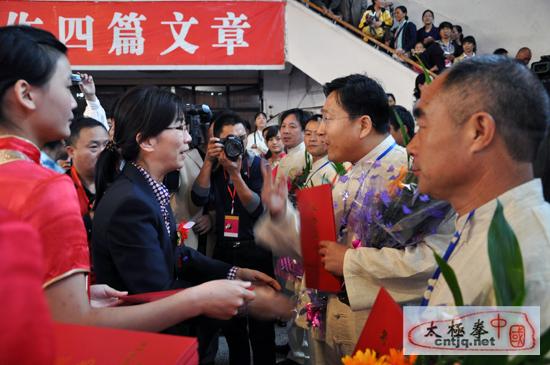 2010中国陈家沟太极拳邀请赛开幕式上,河南省武术运动管理中心主任助理陈沛菊为中国太极拳文化研究基地评选的百名太极拳名师颁发荣誉证书。